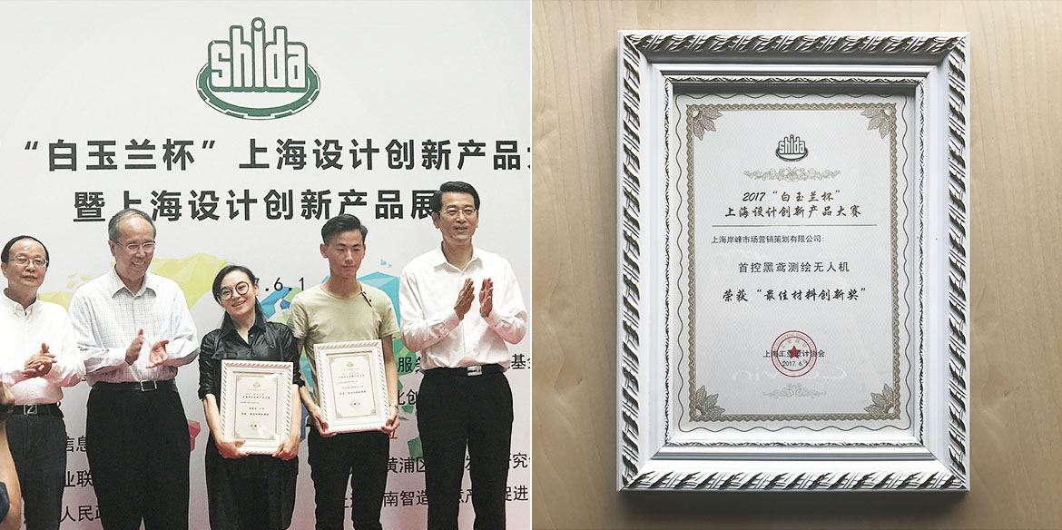 岸峰團(tuán)隊(duì)設(shè)計(jì)作品--首控黑鳶測繪無人機(jī),一舉拿下2017“白玉蘭杯”上海設(shè)計(jì)創(chuàng)新產(chǎn)品大賽“最佳材料創(chuàng)新獎(jiǎng)”